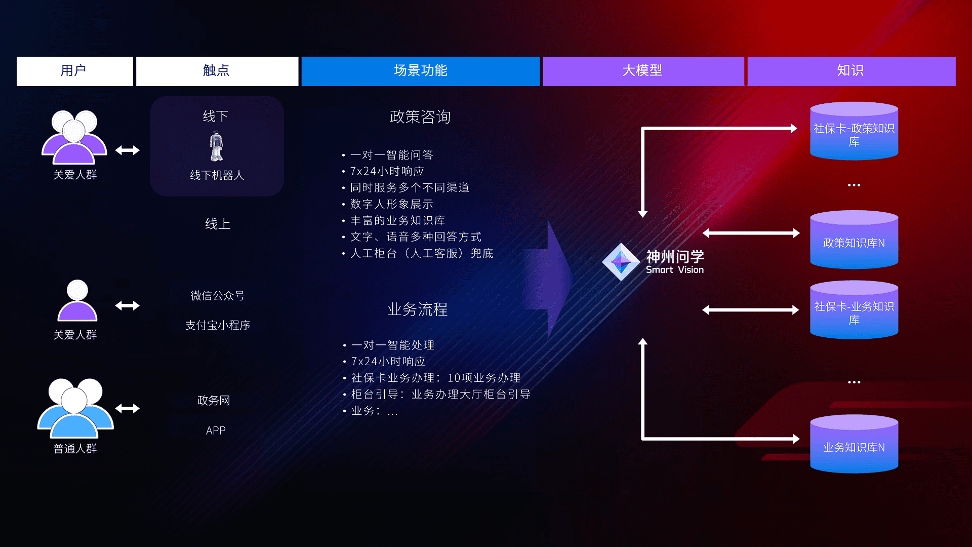 • 线上线下全覆盖:线上提供微信公众号、、、、支付宝小程序、、政务网、、、app多种渠道,,,与线下机器人形成完整服务体系。。