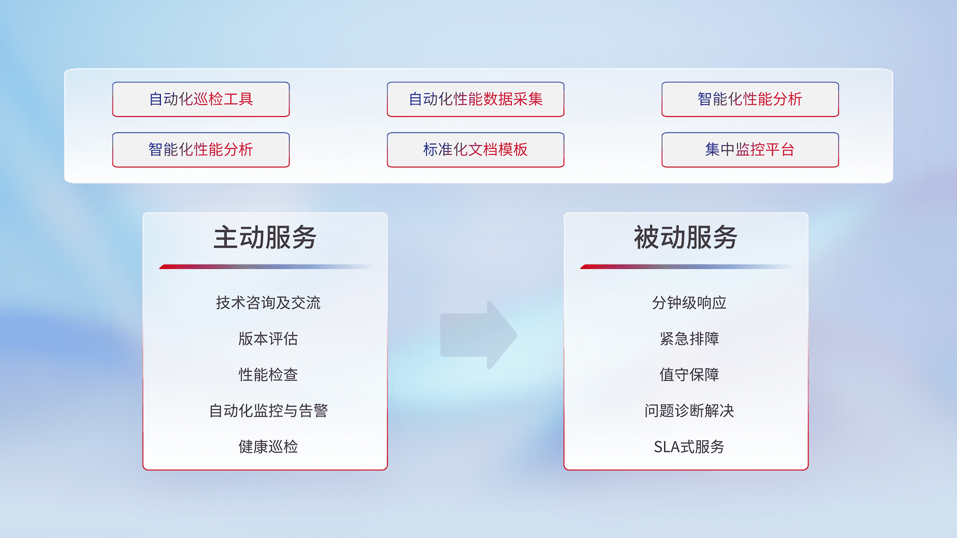 智能化工具和标准化文档,,,保障服务质量,,提供主动服务(包含技术咨询、、版本评估、、、、性能检查、、自动化监控与告警、、、健康巡检)和被动服务包含(分钟级响应、、、、紧急排障、、值守保障、、问题诊断解决、、、、SLA服务)。。